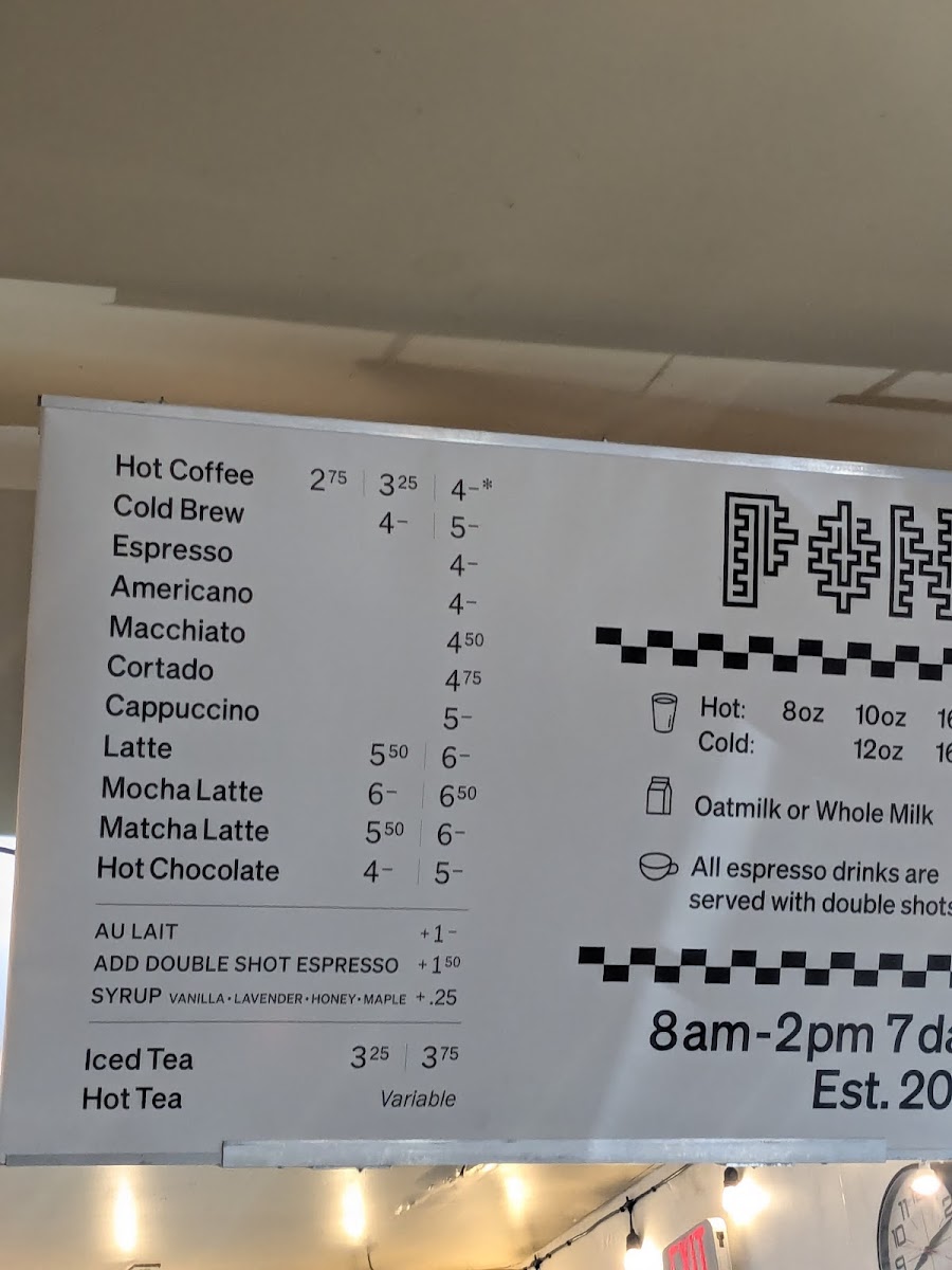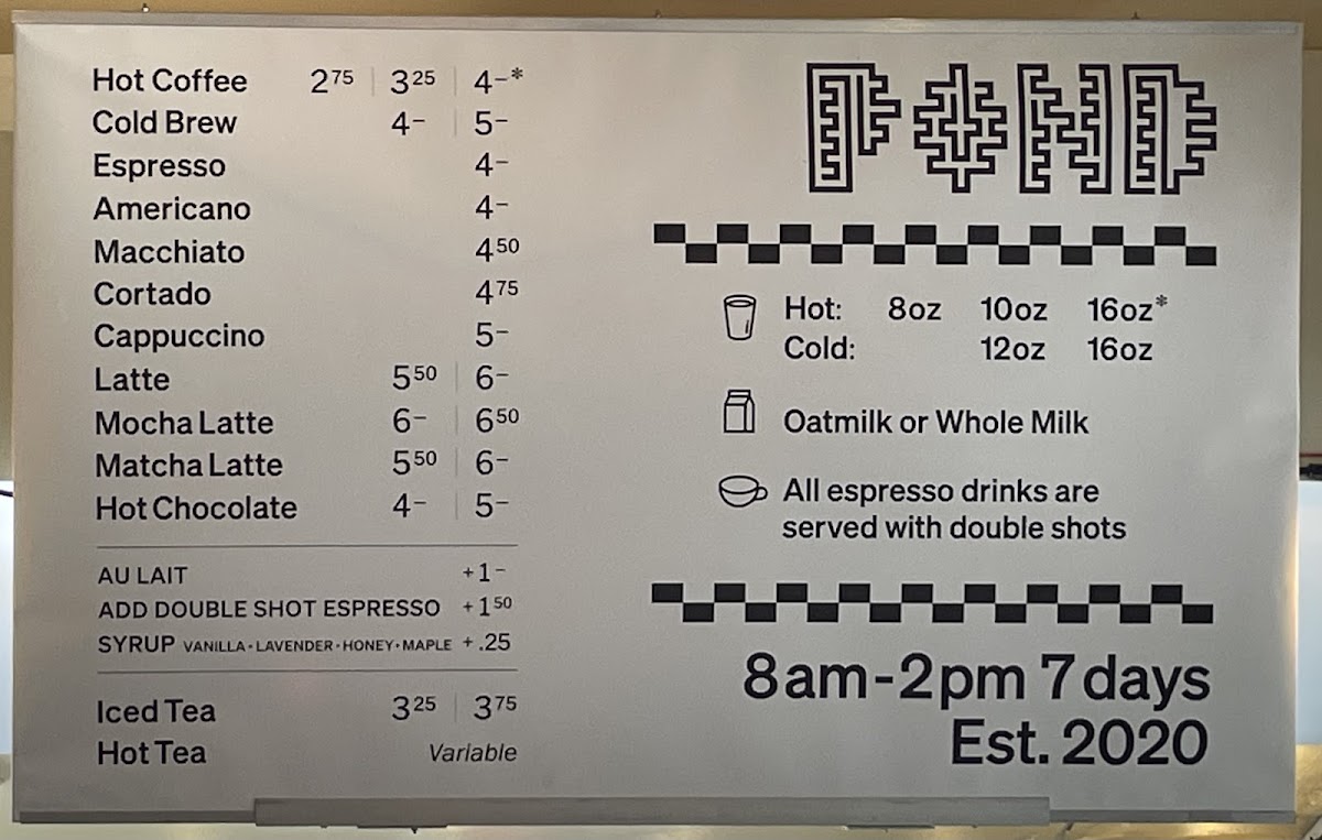 - Coffee and Espresso Drinks: This includes espresso shots, cortados, drip coffee, and specialty lattes with options for different milk types like whole and oat milk. Flavored syrups such as vanilla, lavender, maple, and mocha may be available to customize drinks.
